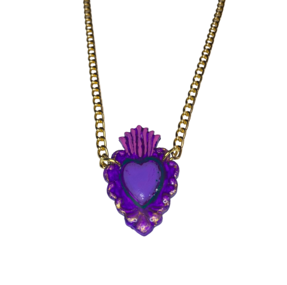 Collar Milagritos morado con corazón violeta y relieve ornamental en púrpura y dorado. Un amuleto contemporáneo de inspiración devocional, lleno de color y simbolismo.