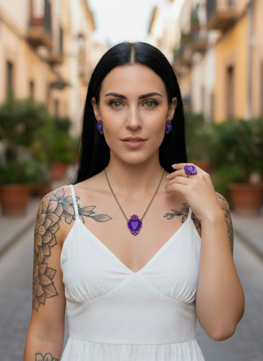 El collar Milagritos morado es una joya de fuerte carga simbólica inspirada en los tradicionales corazones milagro o exvotos devocionales latinoamericanos. Su colgante presenta un corazón central en tono violeta profundo, rodeado por un marco ornamental en púrpura brillante con sutiles acentos dorados que realzan su carácter artesanal y luminoso. En la parte superior, una llama estilizada corona el diseño, evocando luz, fe, protección y esperanza.