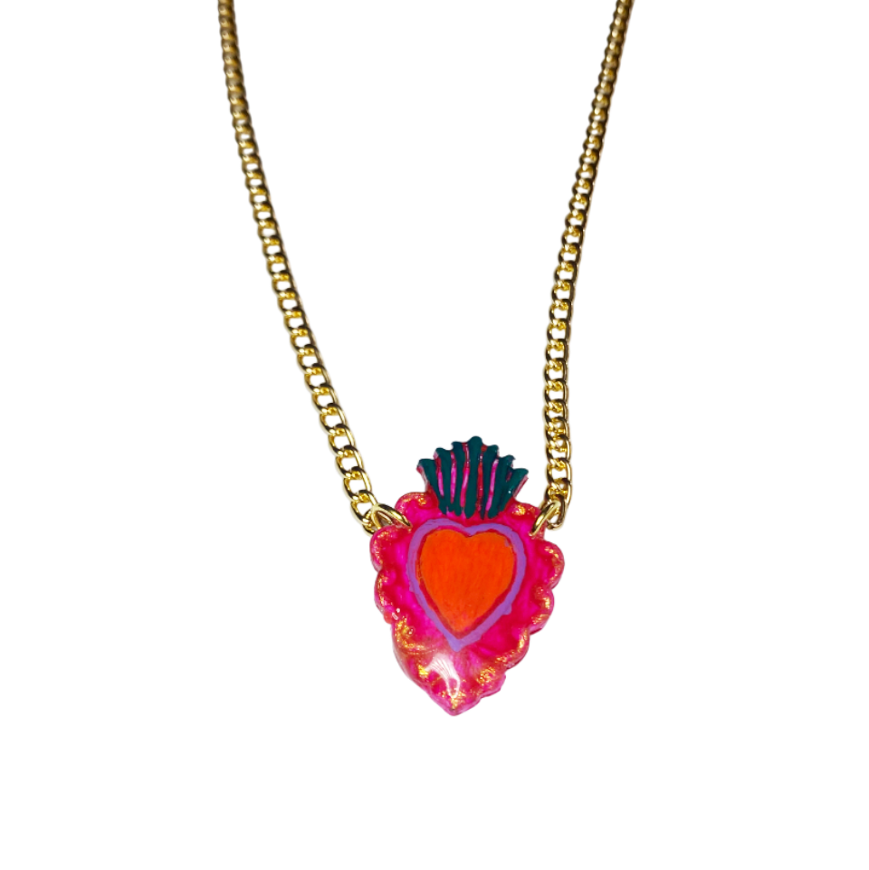 Collar artesanal con corazón milagro en rosa fucsia y corazón central naranja, con detalles en relieve y acabado vibrante. Una pieza llena de energía y personalidad.