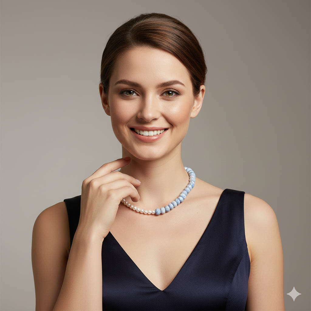 Una mitad formada por perlitas pequeñas, luminosas y suaves, que aportan un toque atemporal y sofisticado.
