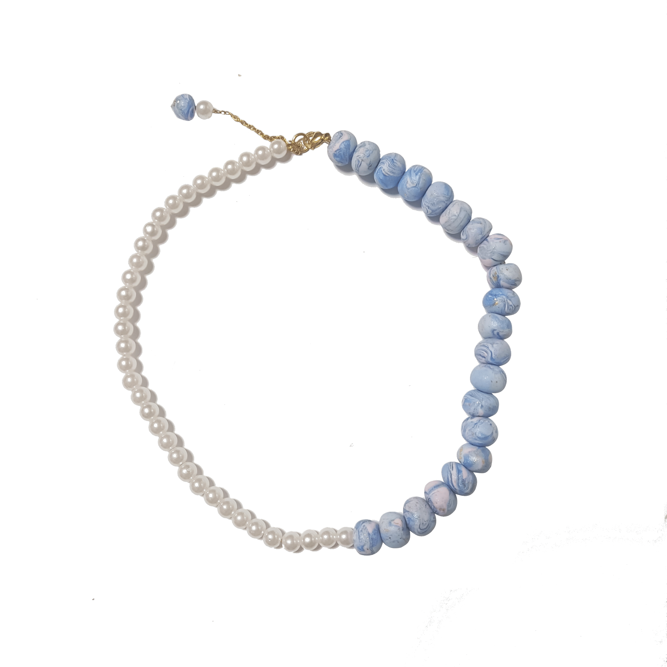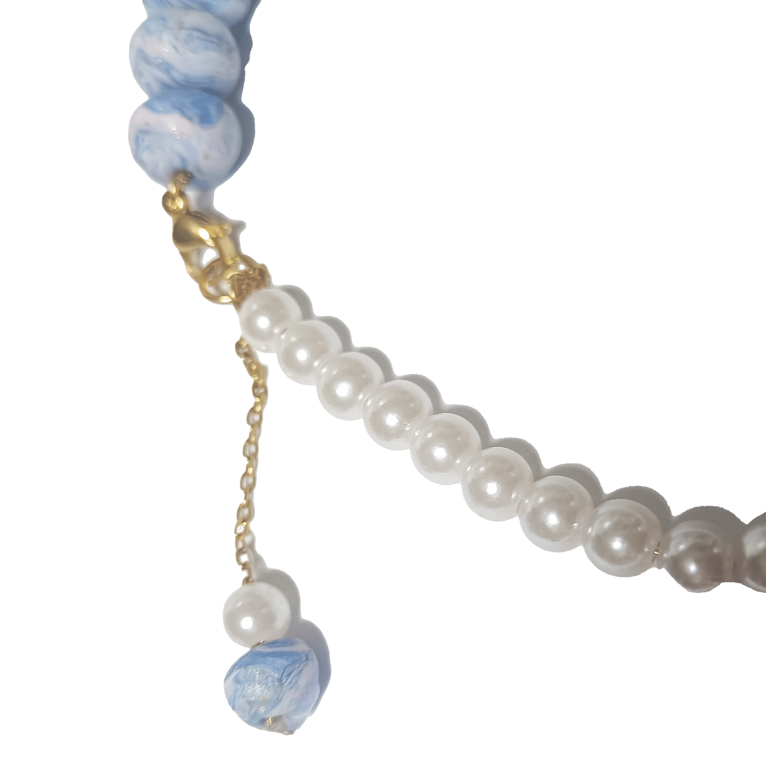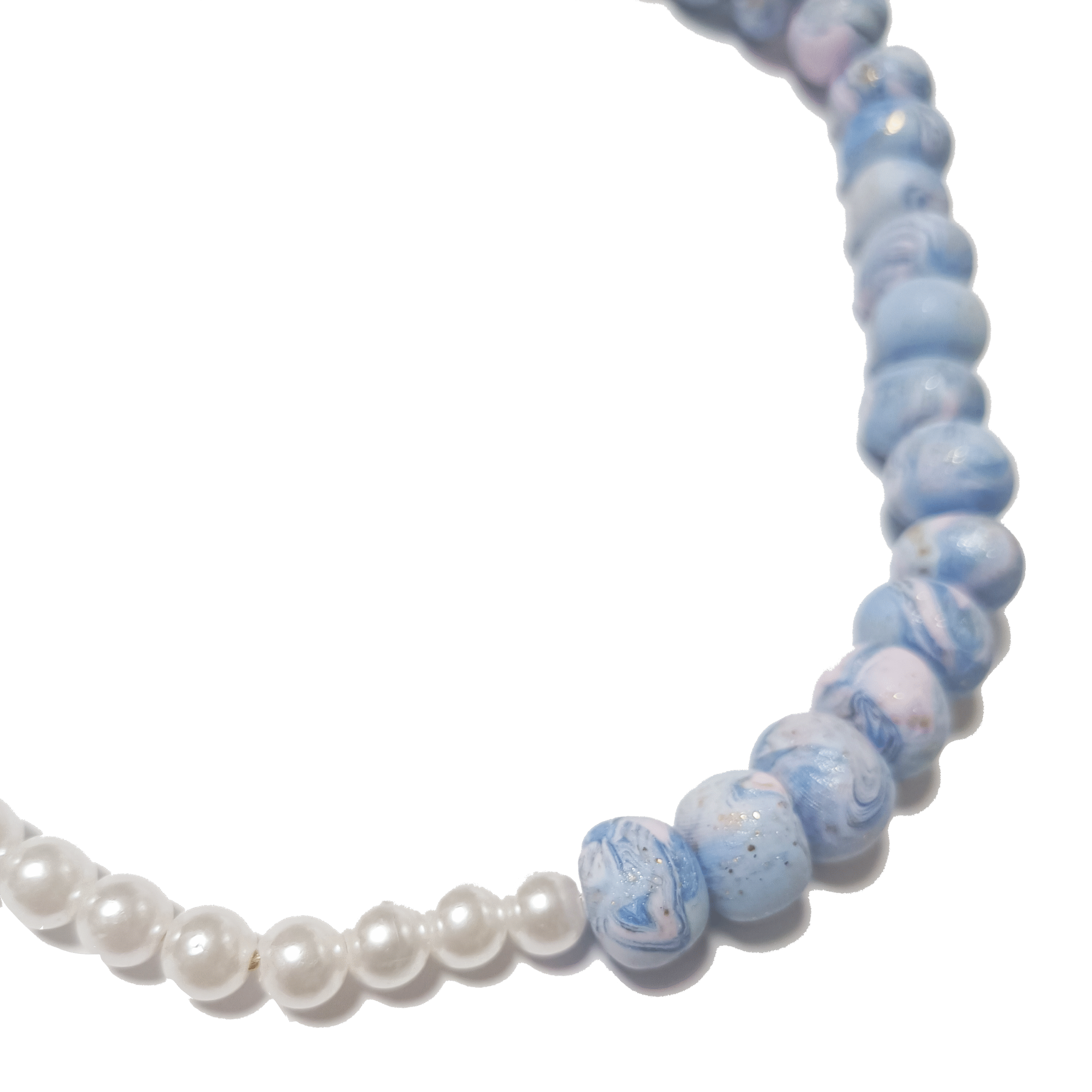La otra mitad compuesta por bolitas de arcilla polimérica modeladas a mano, cada una con un acabado único que mezcla colores azulados (claros y profundos), toques malva, rosa palo y detalles de pan de oro que añaden brillo y carácter. Esta combinación crea un efecto marmoleado lleno de matices y personalidad.
