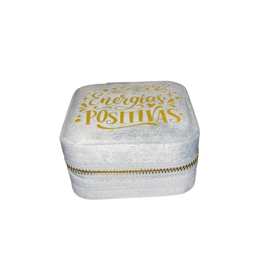 El exterior está confeccionado en terciopelo gris, un color elegante y atemporal, personalizado con vinilo dorado con la frase “energías positivas”, un detalle sutil y motivador que lo convierte en un joyero especial y único.