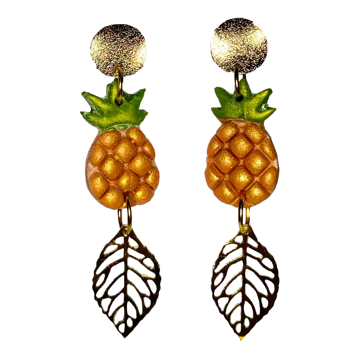 Anara es un pendiente pensado para quienes aman los detalles luminosos y la estética tropical. Su diseño comienza con una piña modelada a mano en arcilla polimérica, un material ligero y resistente que permite crear piezas únicas.