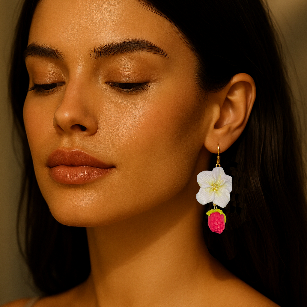 Los Flowerberry son pendientes artesanales que celebran la belleza de la naturaleza. Cada pieza presenta una flor blanca con un sutil toque amarillo en el centro, acompañada de una pieza de acero dorado que simula los estambres y una frambuesa colgante, creando un contraste delicioso y colorido.