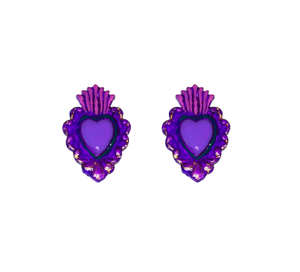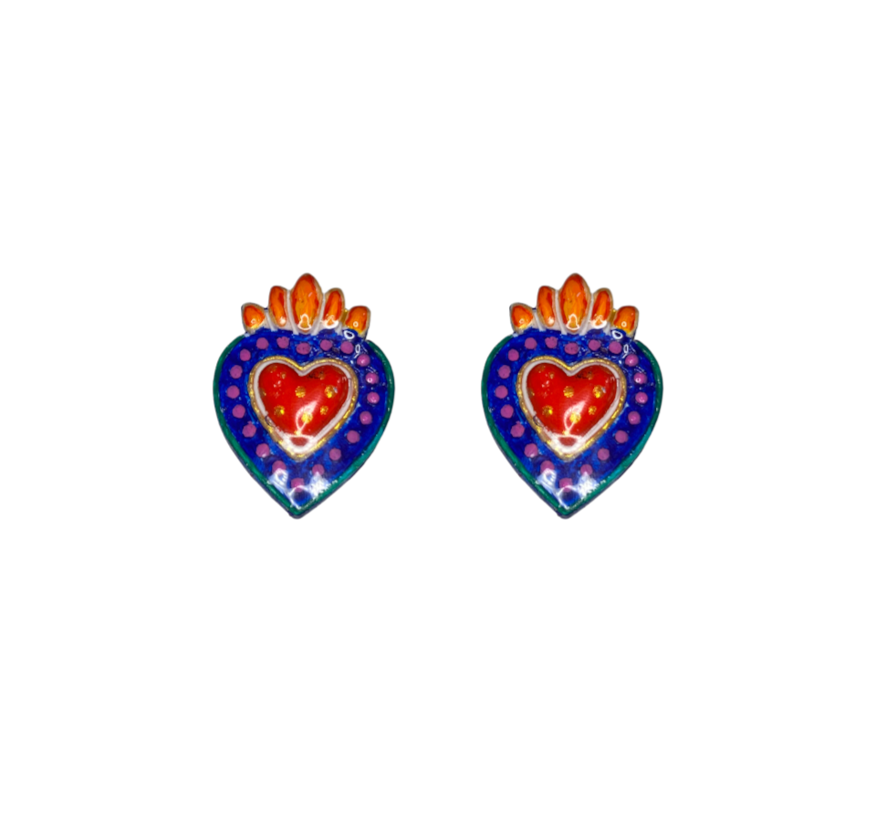 Pendientes artesanales inspirados en el corazón milagro, con relieve, llama superior y acabados vibrantes con detalles dorados. Disponibles en tres submodelos: azul, rosa y morado.