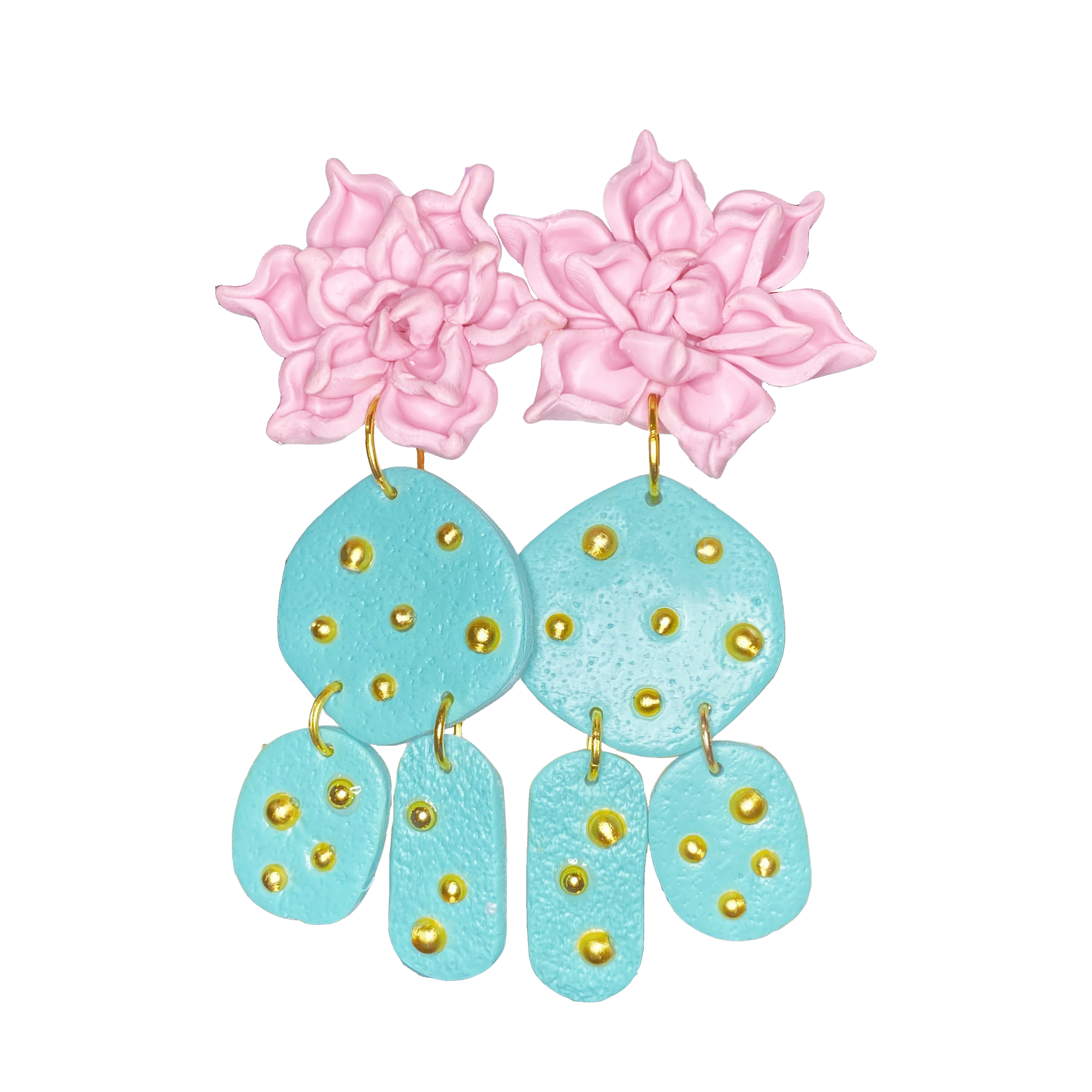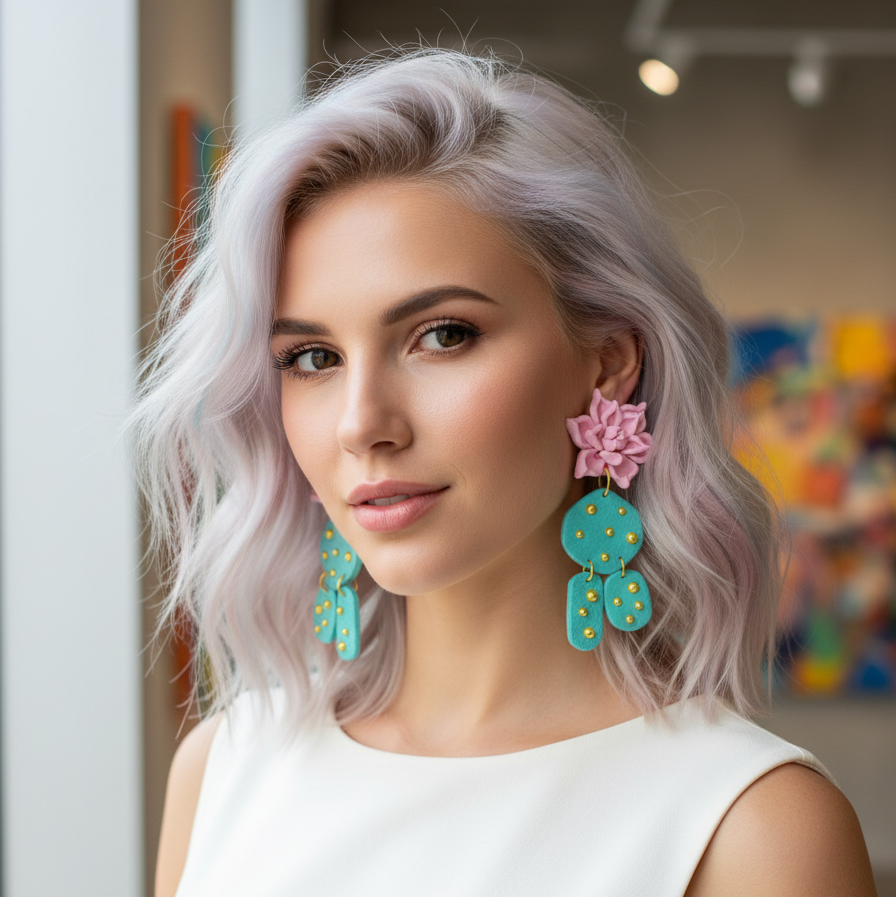 A los lados, dos piezas adicionales en forma de pequeños cactus o segmentos nopal aportan movimiento y un toque juguetón al diseño. Todas las partes están ensambladas con acero inoxidable dorado para asegurar durabilidad, ligereza y un acabado pulido que complementa los tonos vivos de la arcilla polimérica.