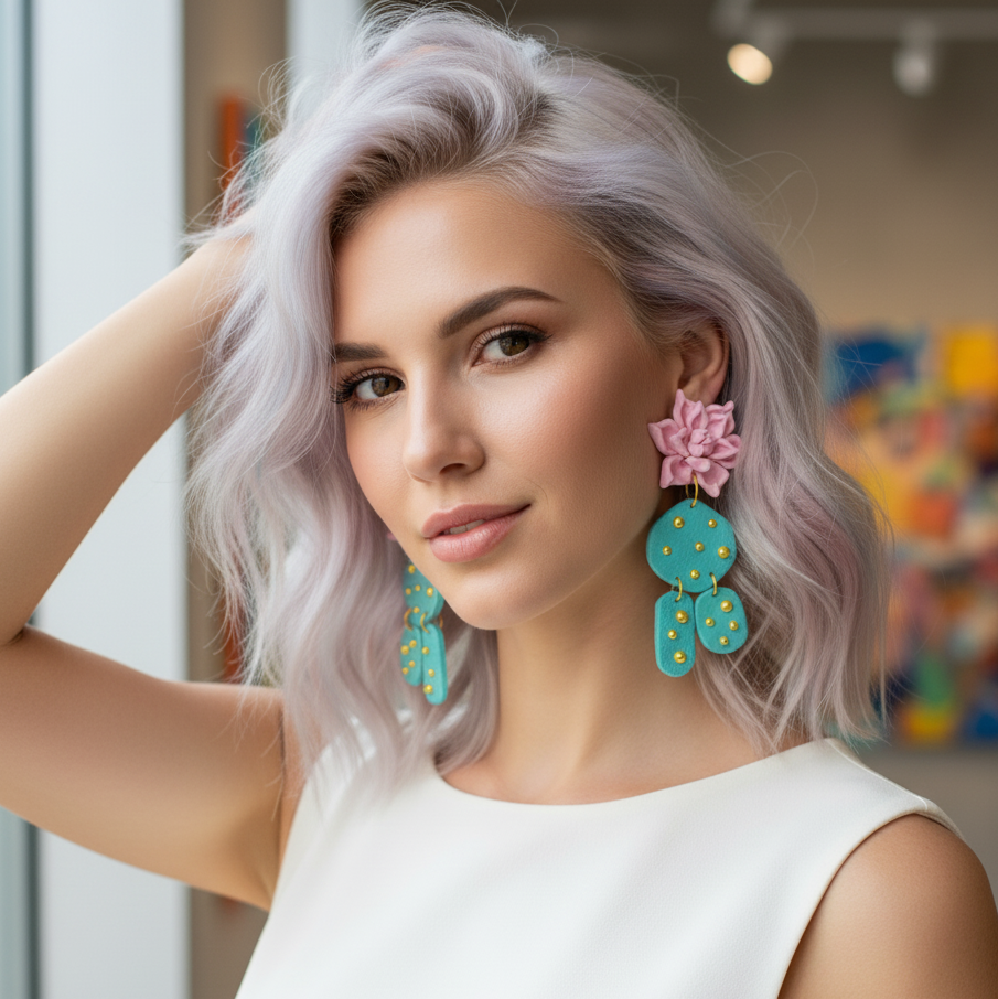 Los pendientes Nopal están inspirados en la belleza vibrante del desierto y en la iconografía del cactus nopal. Su diseño comienza con una delicada flor de cactus en color rosa que actúa como base y se ajusta cómodamente a la oreja. Desde ella desciende un cactus verde hoja, modelado con detalle y decorado con pequeñas tachuelas doradas que resaltan su textura y carácter.